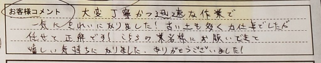 「大変丁寧かつ迅速な作業で、一気にきれいになりました。古い土も多く力仕事でしたが任せて正解です!こちらの業者様にお願いできて嬉しい気持ちになりました。ありがとうございました!」